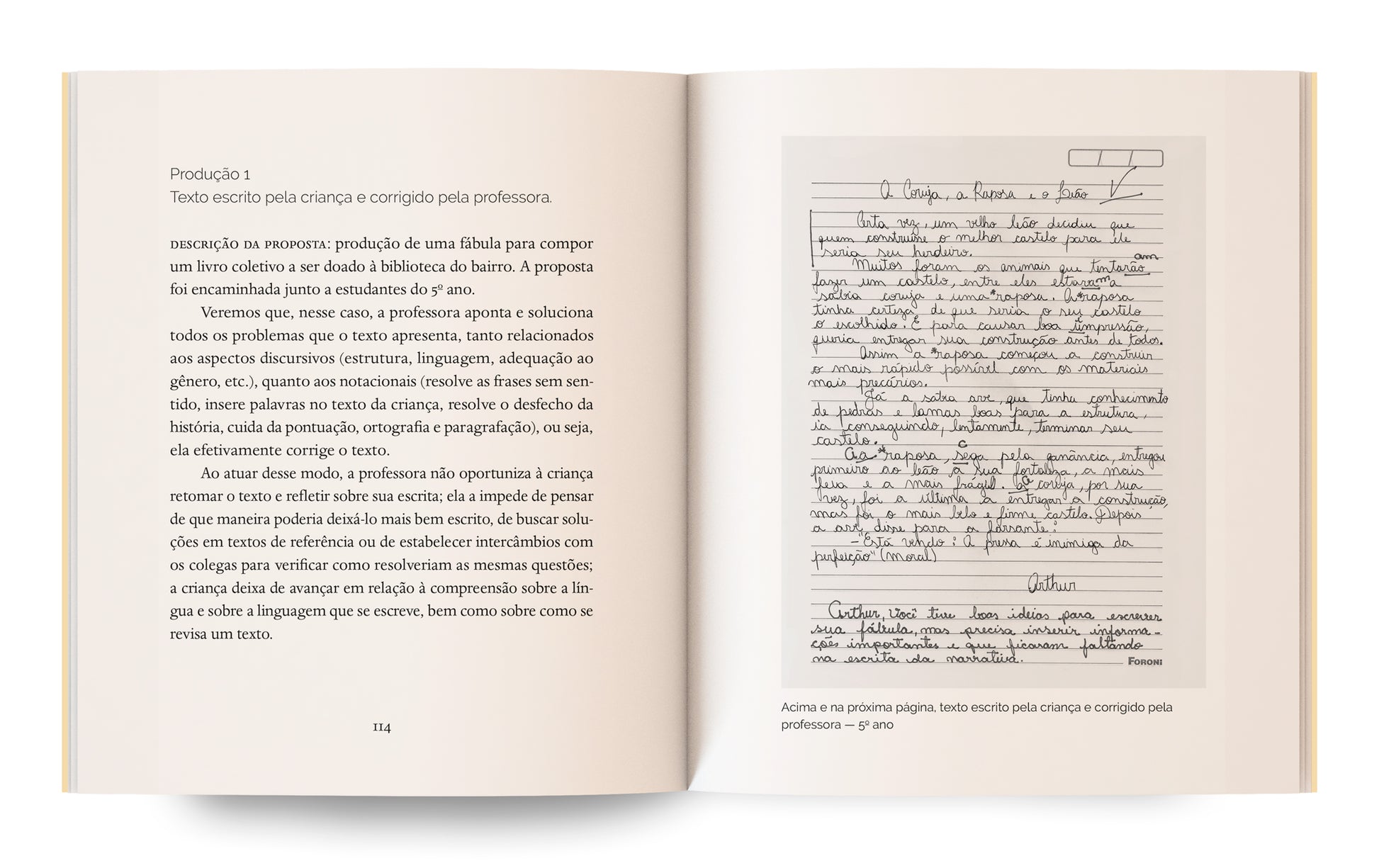 A obra que abre a coleção é também o primeiro volume de uma série intitulada Infâncias e escritas. Produção de textos nas escolas é de autoria de Andréa Luize, Andréa Dias Tambelli e Bárbara Franceli Passos, pedagogas com experiência em formação de professores e longa bagagem em sala de aula. O livro é um convite para que os educadores possam refletir sobre sua prática nas situações em que as crianças escrevem; observar como elas aprendem, pensar sobre os caminhos que favorecem o desenvolvimento de gêneros, vocabulários e práticas escritas. As autoras partem da concepção de que são múltiplas as infâncias e diversas as realidades para discutir a produção de textos na educação infantil e séries iniciais do ensino fundamental. As crianças são vistas aqui como potenciais escritoras, sujeitos ativos e inteligentes, que apontam caminhos e possibilidades aos mediadores e professores.